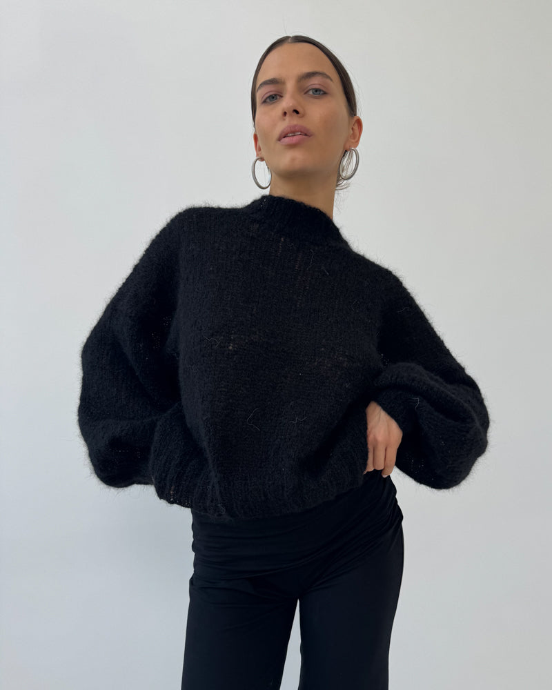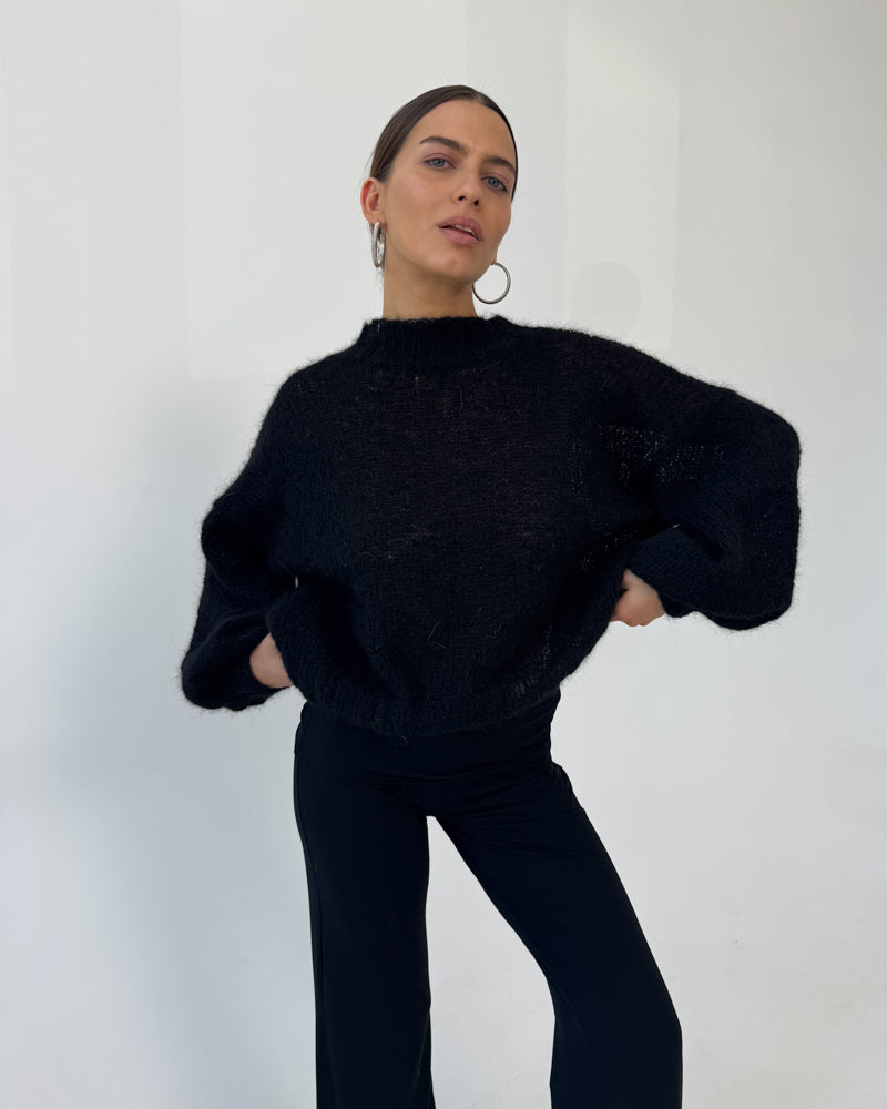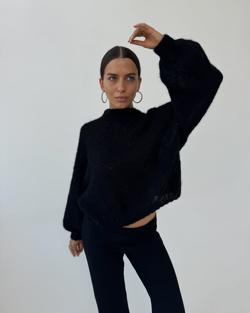 Czarny odcień podkreśla jego ponadczasowy charakter – pasuje do wszystkiego i zawsze wygląda szlachetnie. To sweter, który nie potrzebuje dodatków – sam w sobie stanowi luksusową bazę stylu.