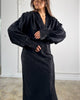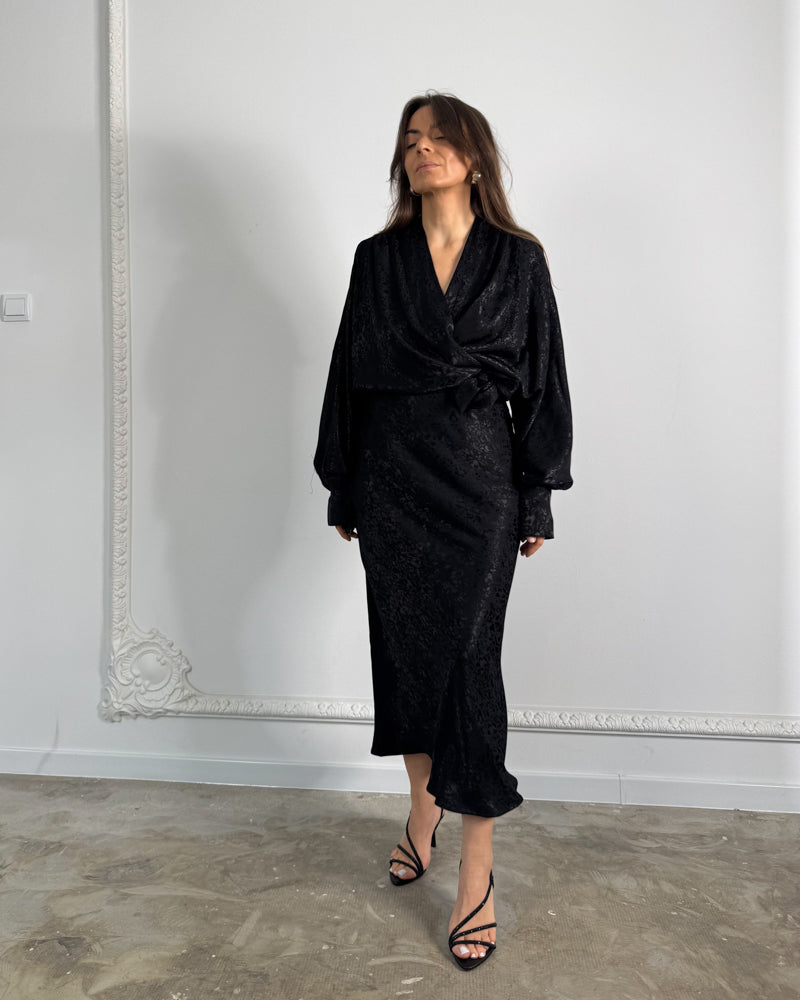 Długie rękawy zakończone mankietami zapinanymi na guzik wprowadzają elegancką strukturę i pozwalają stylizować koszulę zarówno w wersji wieczorowej, jak i bardziej formalnej. Żakardowa tkanina premium pięknie pracuje ze światłem, nadając czerni głębi i szlachetnego wyrazu.