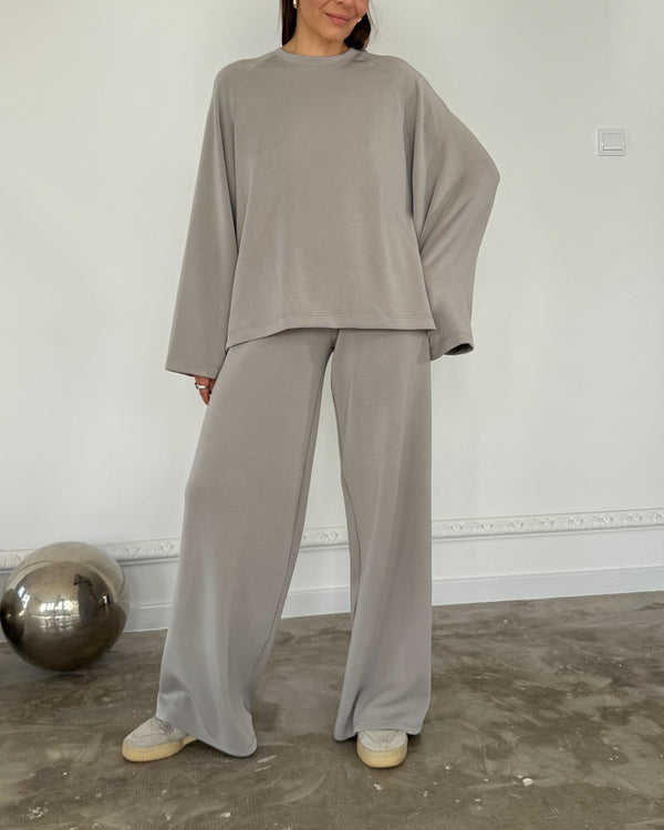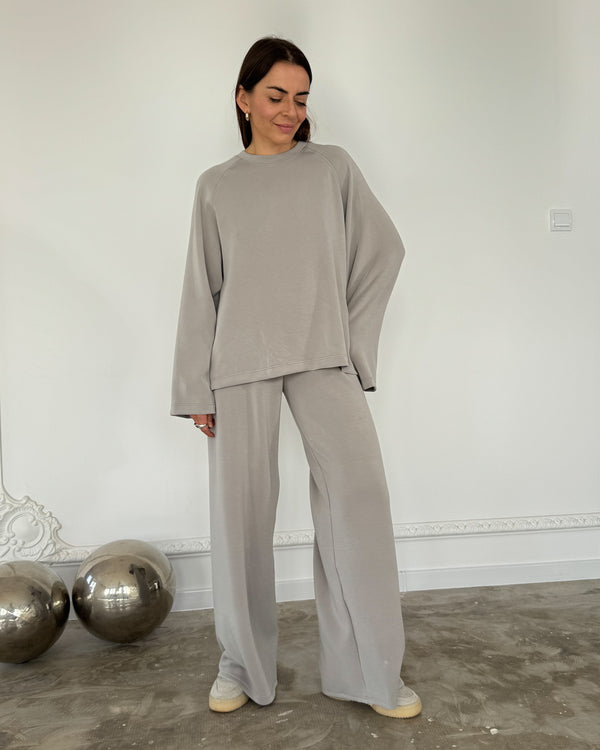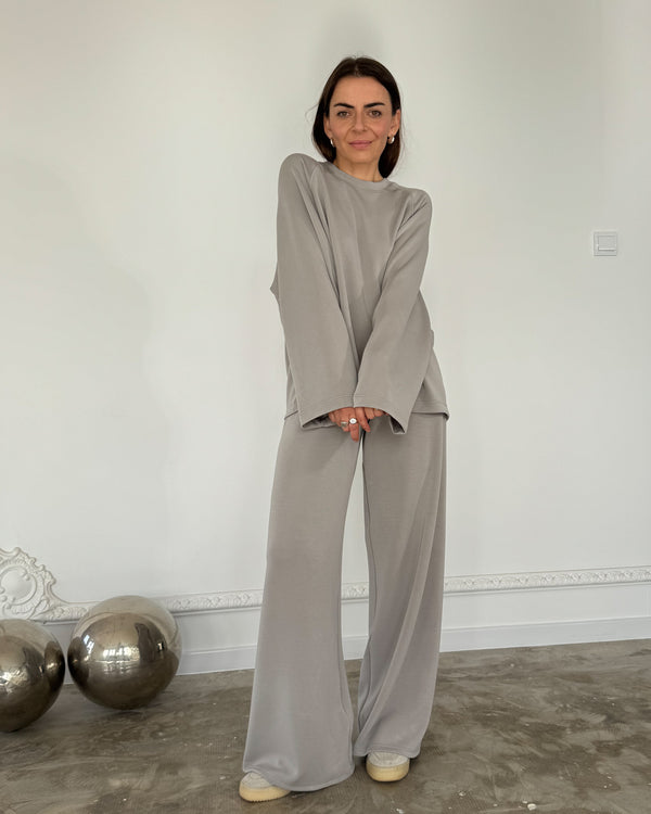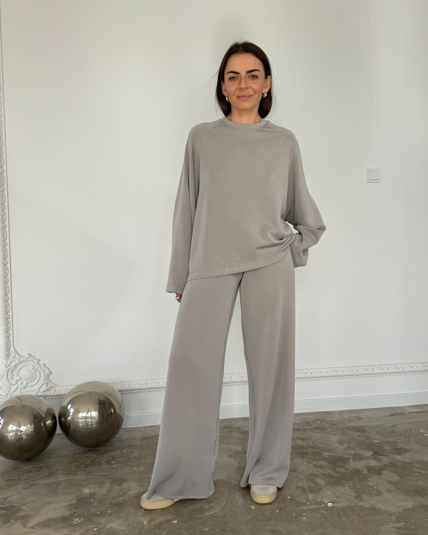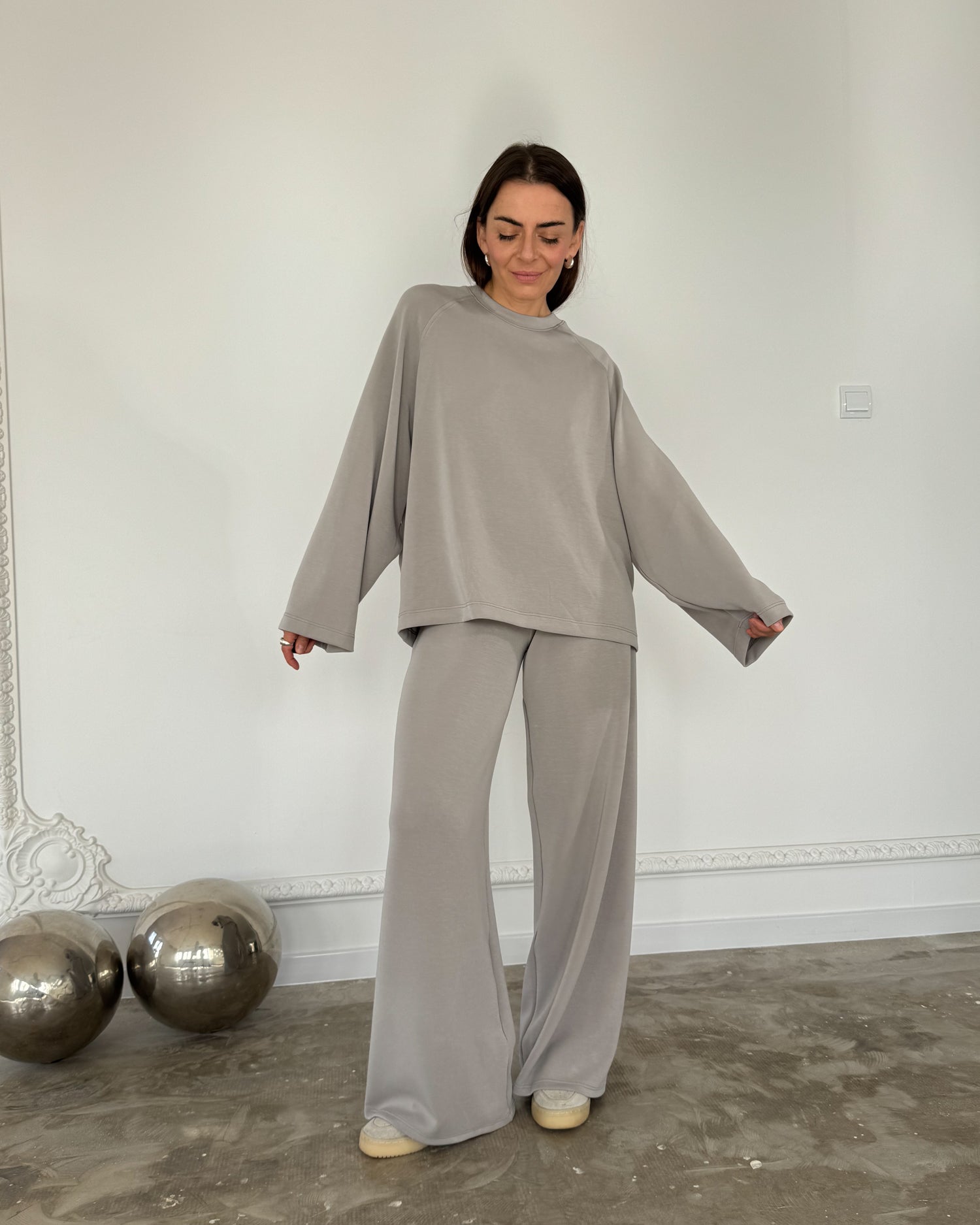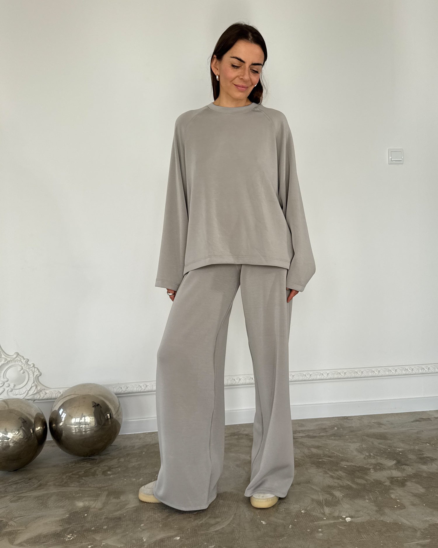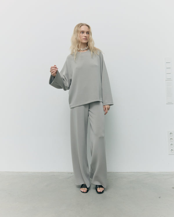 Oversize’owy fason z szerokimi rękawami i dekoltem typu crew neck sprawia, że longsleeve ma swobodny charakter, a jednocześnie wygląda nowocześnie i stylowo. Neutralny odcień paloma – jasny, elegancki szary – jest bazą, która dopasuje się do każdej garderoby, niezależnie od okazji.