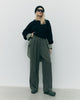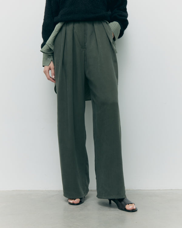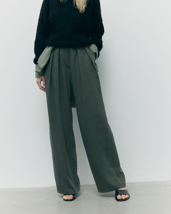Perfekcyjnie skrojony fason z wysokim stanem, zakładkami w talii i szeroką nogawką optycznie wysmukla sylwetkę, nadając jej lekkości i proporcji. Głęboki odcień Olive to szlachetna zieleń, która świetnie wpisuje się w minimalistyczne stylizacje kapsułowej garderoby – od biurowej elegancji po casualowe looki z nutą nonszalancji.