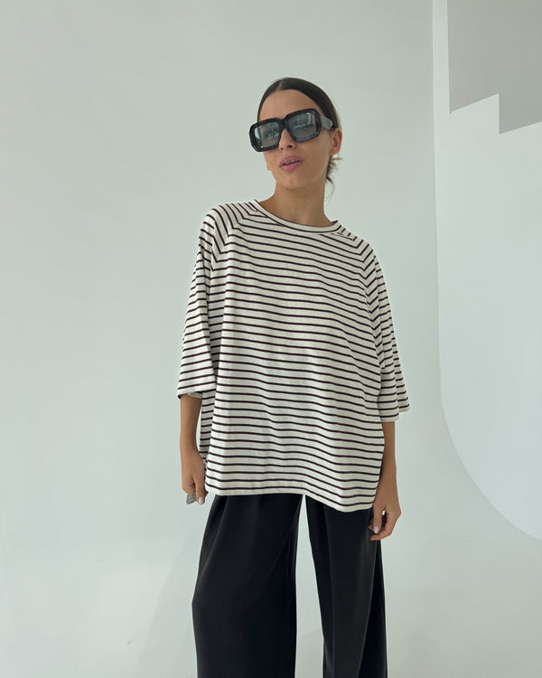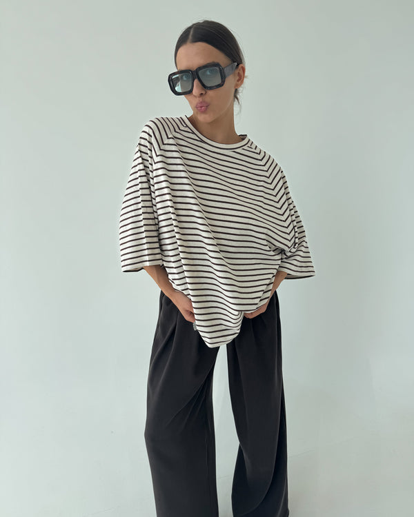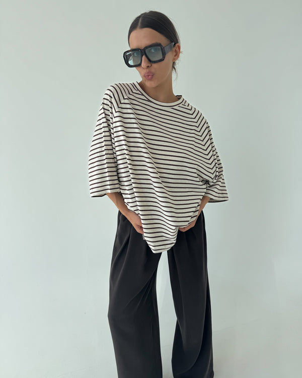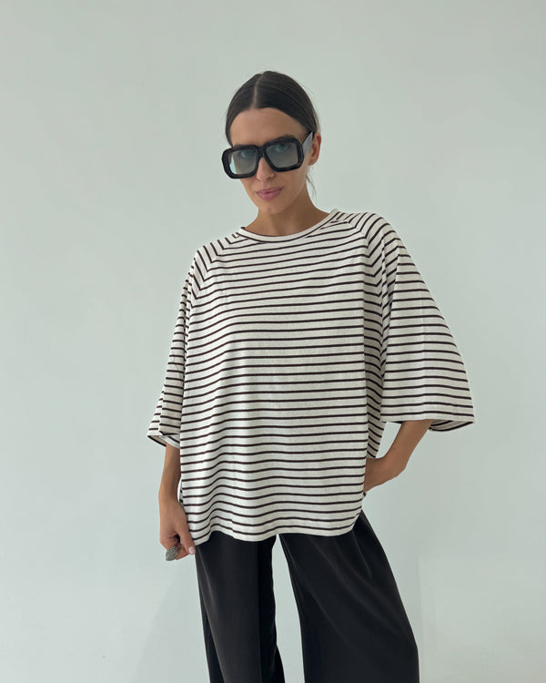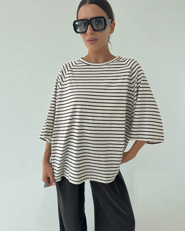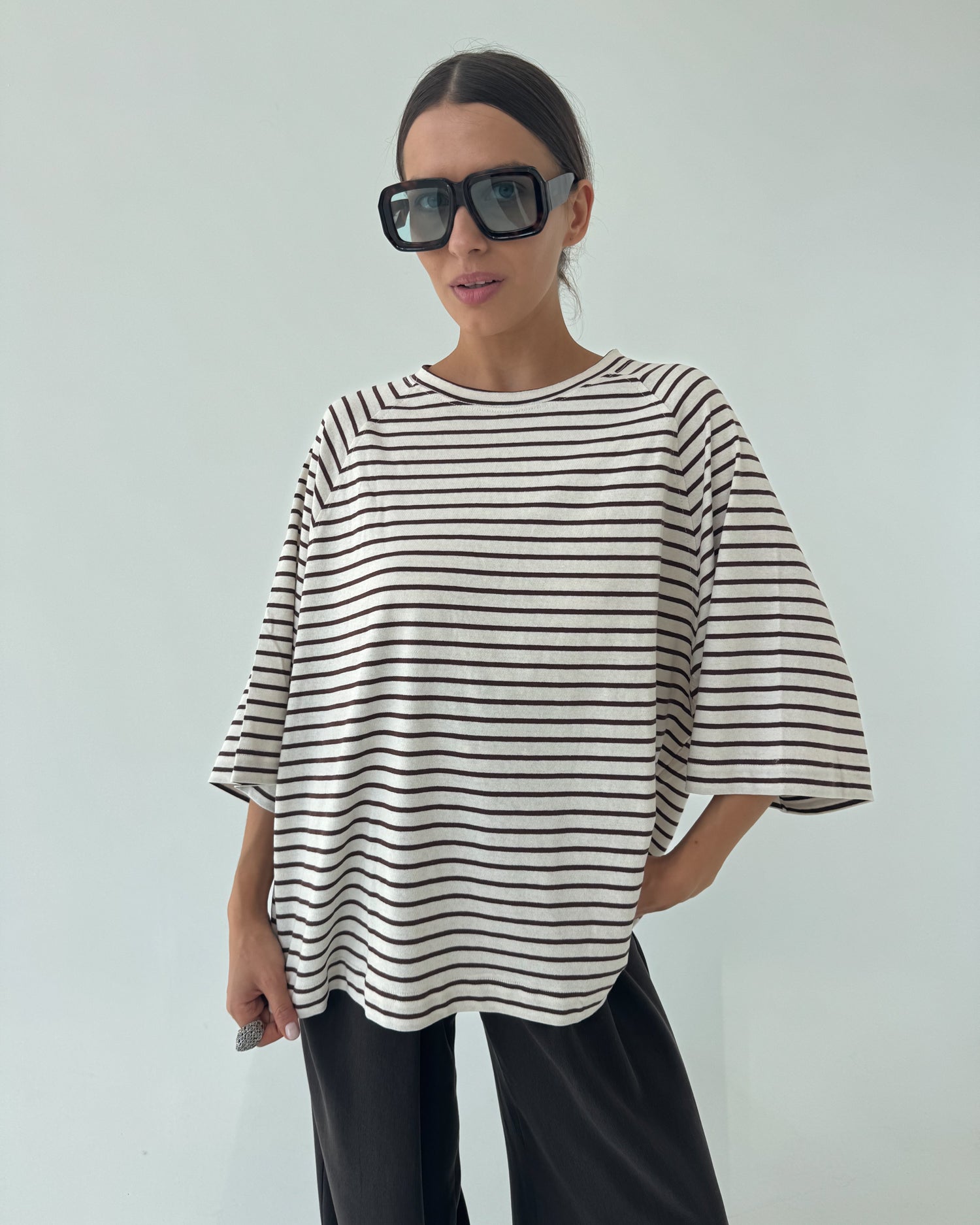 T-shirt Chillout – chocolate stripes to nowoczesna baza w kapsułowej garderobie. Uszyty z wysokogatunkowej bawełny, zachwyca strukturą i miękkością. Połączenie kremu i czekoladowego brązu tworzy ponadczasowy wzór w paski, który nadaje stylizacji naturalnej elegancji.