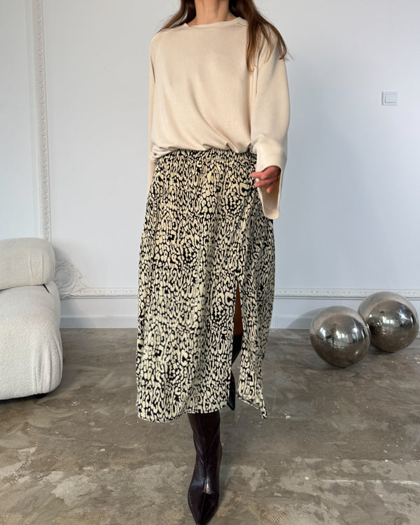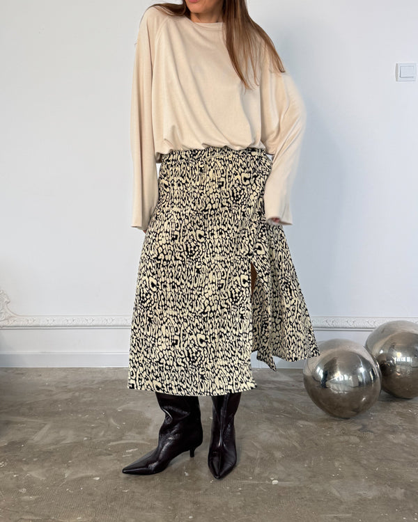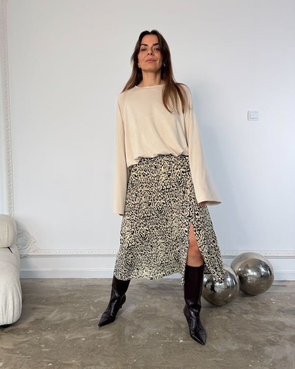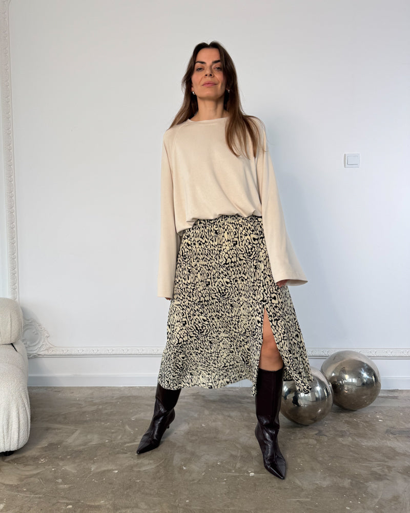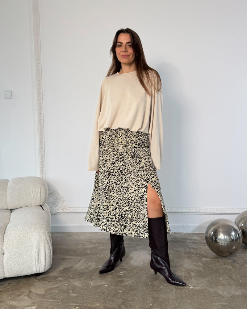 Wzór Animale New w odcieniach ecru i czerni to nowoczesna interpretacja klasyki – przyciąga uwagę, ale pozostaje spójny z ideą kapsułowej garderoby. Doskonale komponuje się z jednolitymi topami, golfami i koszulami Calm.