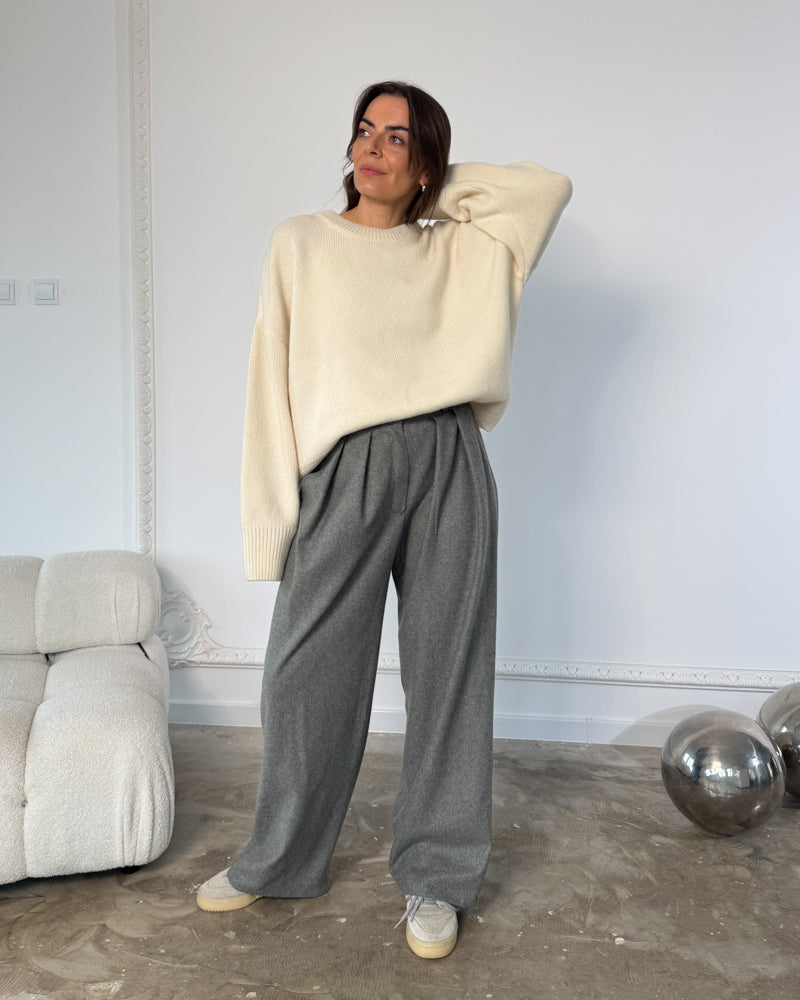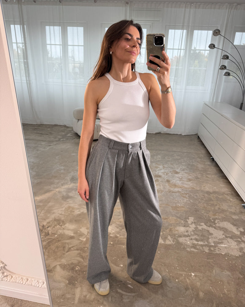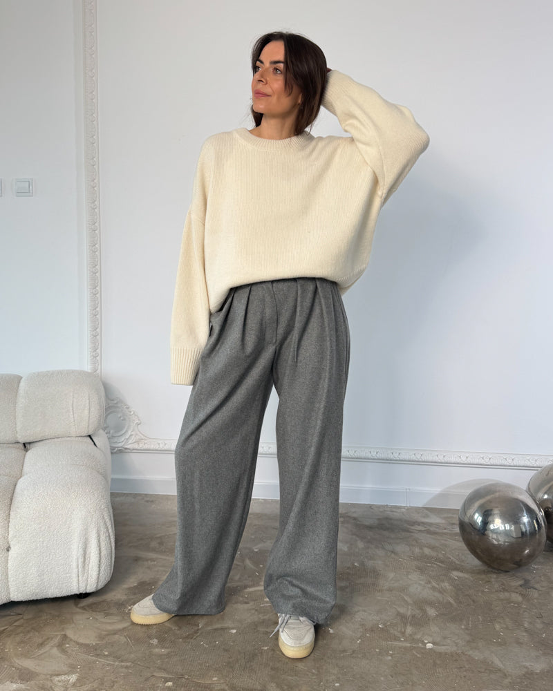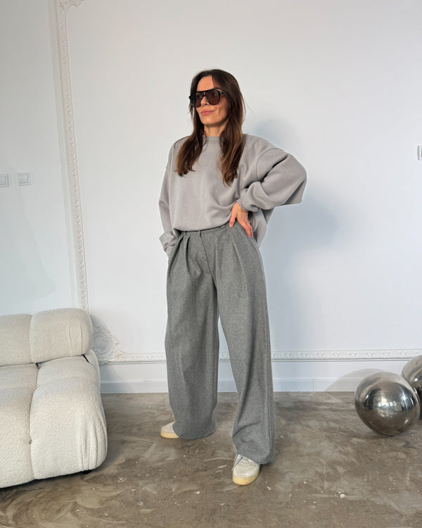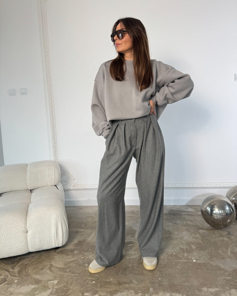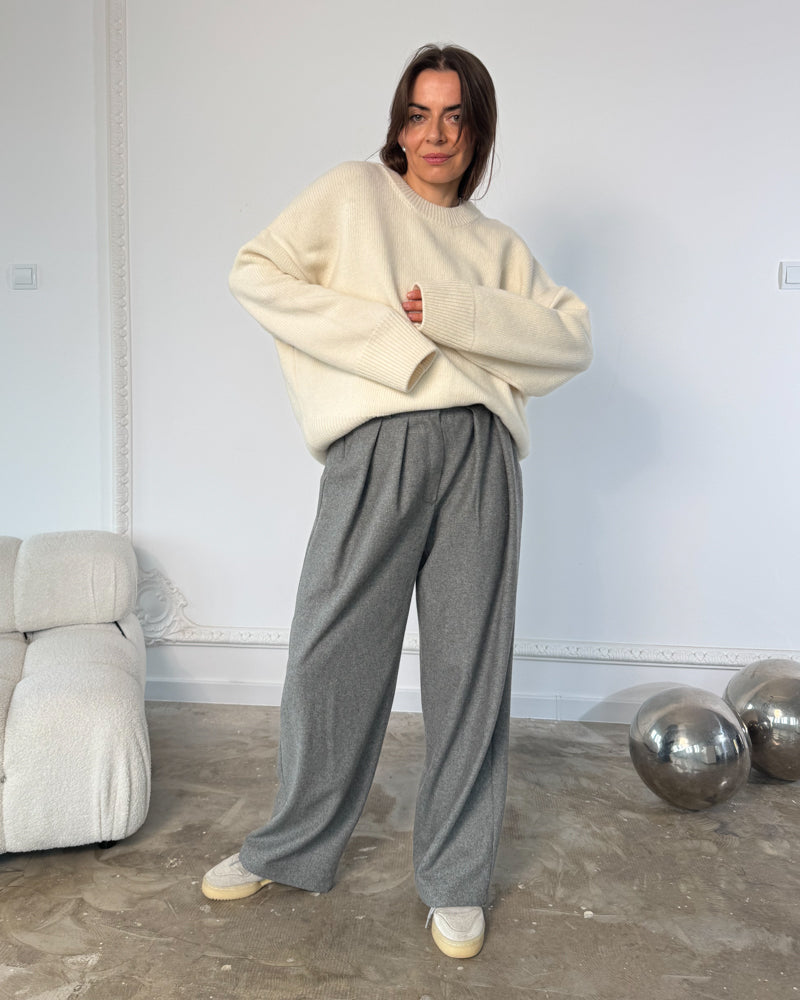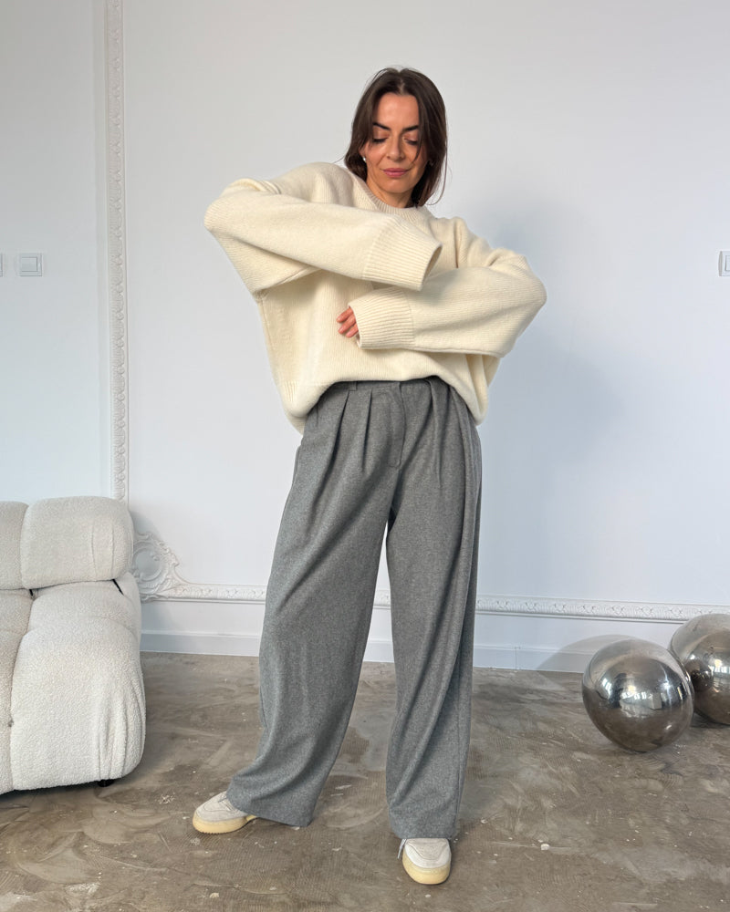 Perfekcyjny krój z wysokim stanem, zakładkami w talii i szeroką nogawką subtelnie wydłuża i wysmukla sylwetkę. Kolor Grey Melange – elegancka, melanżowa szarość – dodaje stylizacjom klasy i lekkości, tworząc idealną bazę dla kapsułowej garderoby.