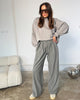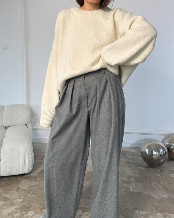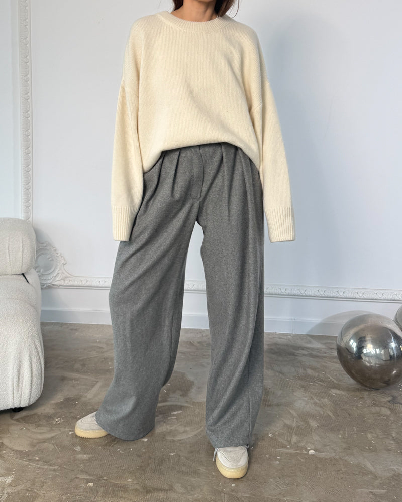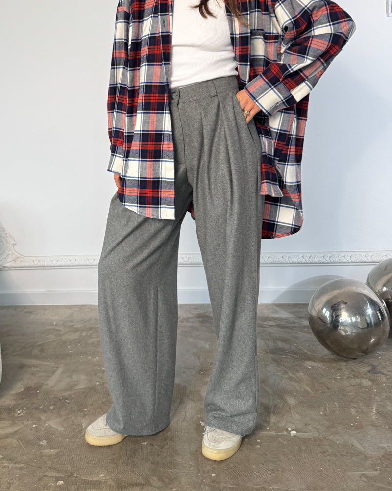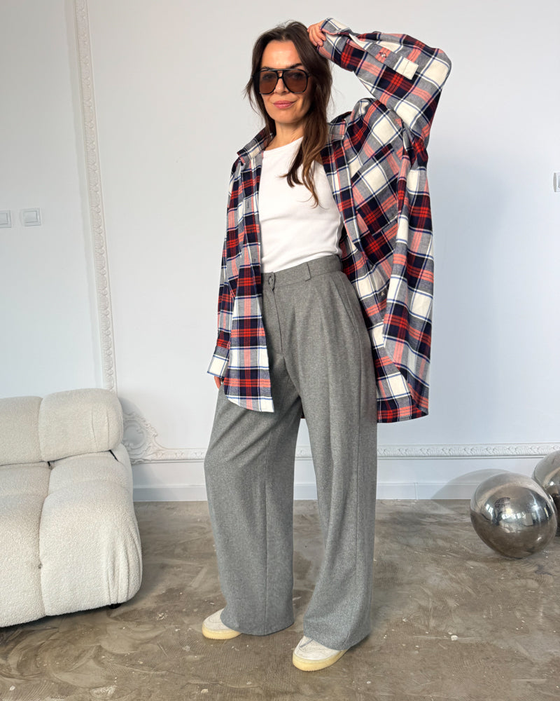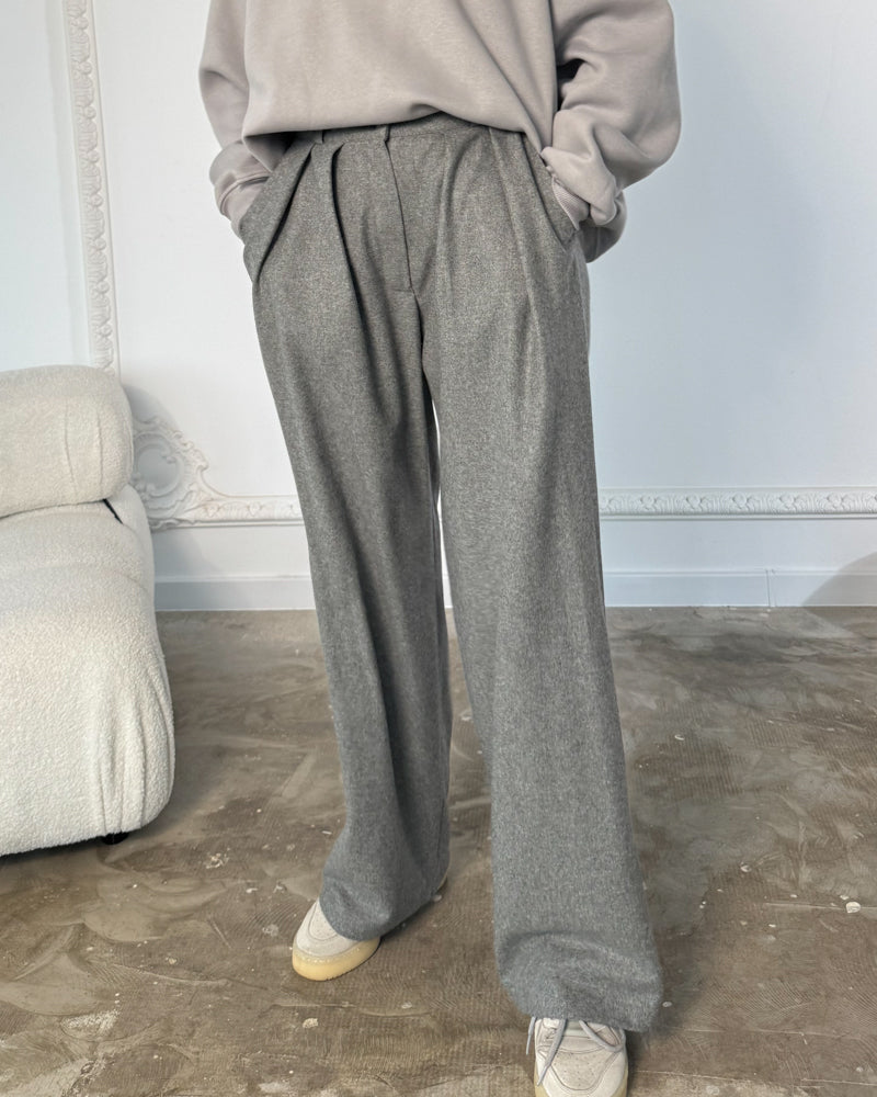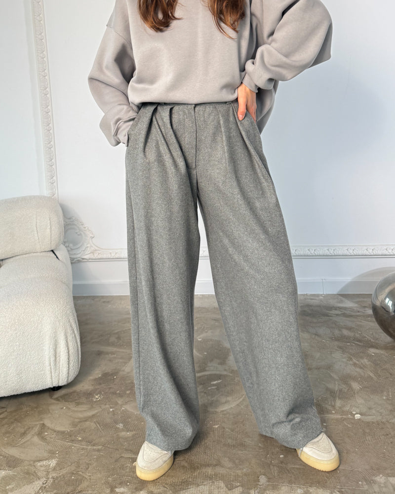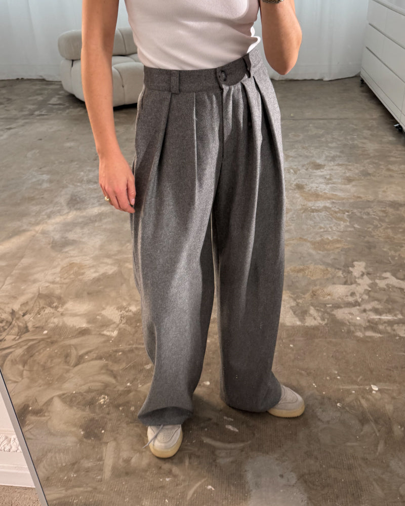 Perfekcyjny krój z wysokim stanem, zakładkami w talii i szeroką nogawką subtelnie wydłuża i wysmukla sylwetkę. Kolor Grey Melange – elegancka, melanżowa szarość – dodaje stylizacjom klasy i lekkości, tworząc idealną bazę dla kapsułowej garderoby.