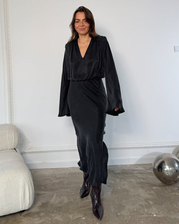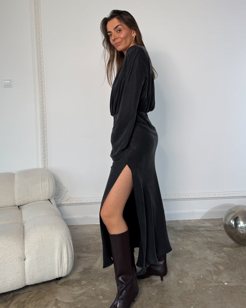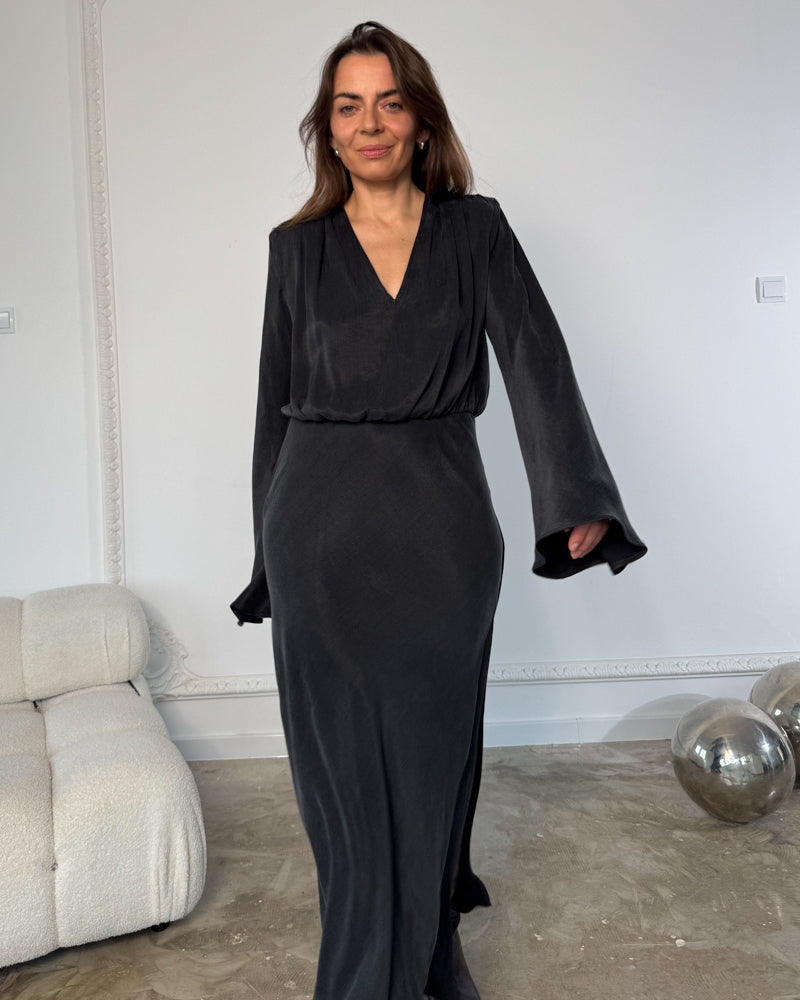 Elegancka, ponadczasowa czarna sukienka z gładkiej, lejącej tkaniny lyocell. Architektoniczny krój z odpinanymi poduszkami na ramionach, głębokim dekoltem V i dołem krojonym po skosie subtelnie podkreśla talię. Długie, eteryczne rękawy dodają lekkości. Idealna na wieczór, uroczystości i spotkania przez cały rok. Produkcja w Polsce.