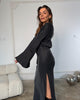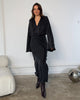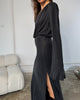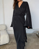 materiał: żakard premium – wiskoza z lyocellem kolor: Black – głęboka, elegancka czerń fason: taliowany, dół ze skosem, odpinane poduszki na ramionach rękawy: długie, eteryczne dekolt: wyważony, głęboki w literę V produkcja: Polska – lokalna i świadoma moda
