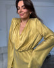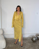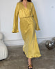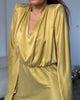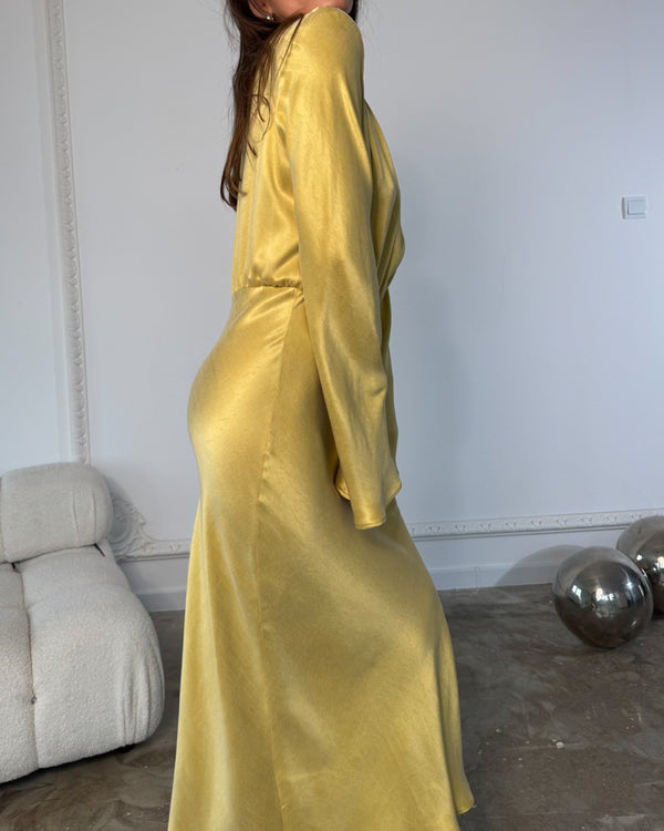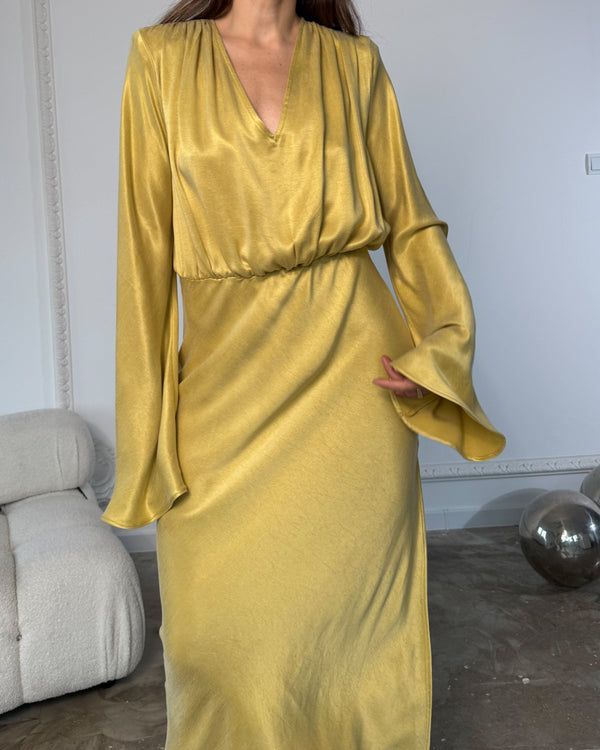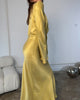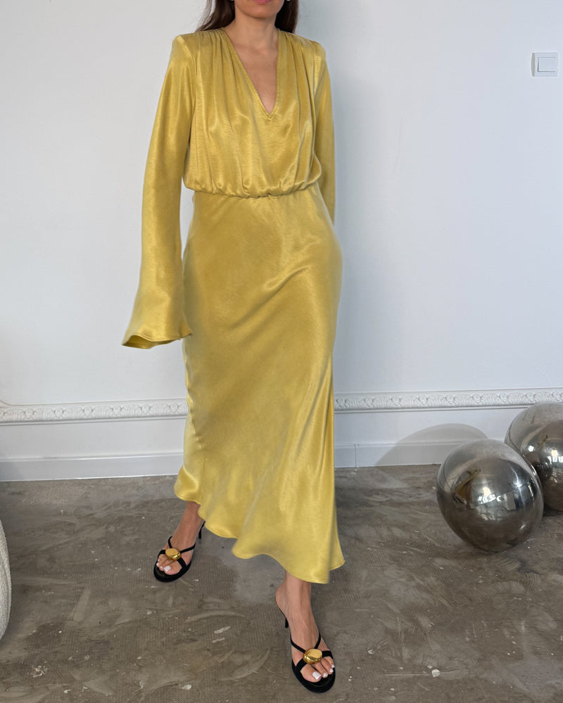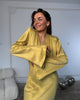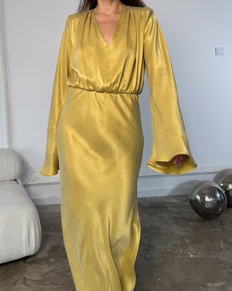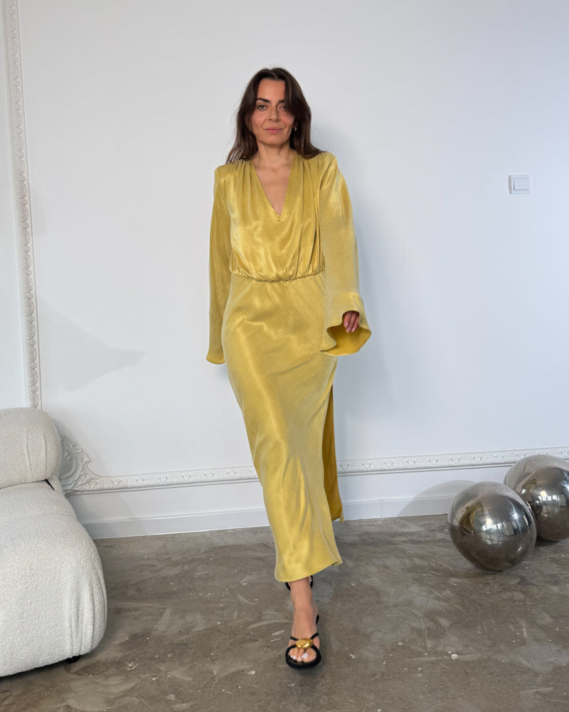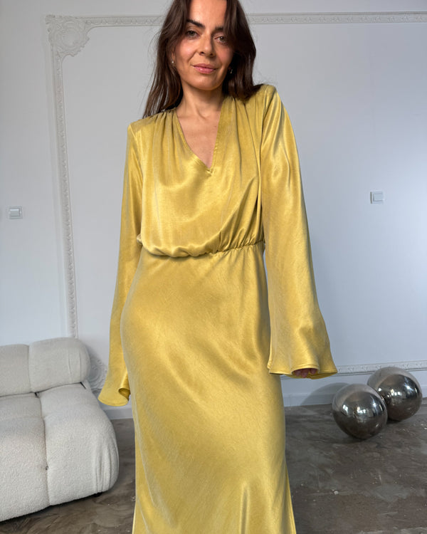 Elegancka, ponadczasowa Sukienka Desire w kolorze Gold z gładkiego, lejącego lyocellu. Architektoniczny krój z odpinanymi poduszkami na ramionach, głębokim dekoltem V i dołem krojonym po skosie subtelnie podkreśla talię. Długie, eteryczne rękawy dodają lekkości. Idealna na wieczór, uroczystości i wyjątkowe okazje przez cały rok. Szyta w Polsce.