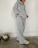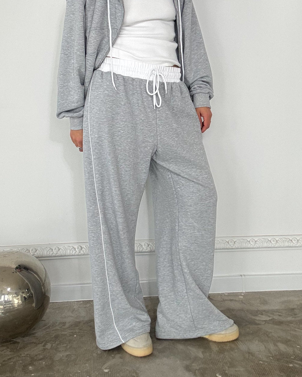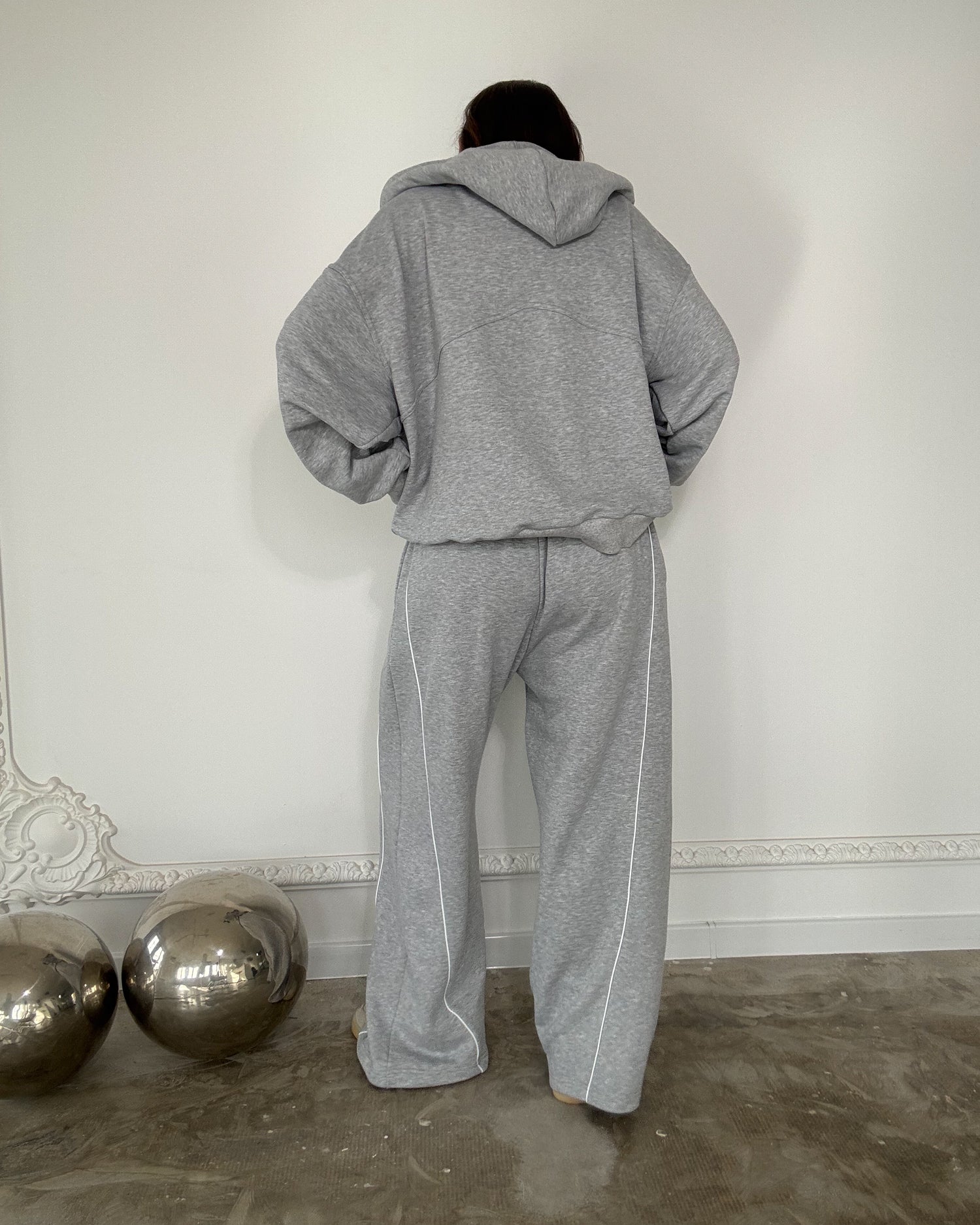 Luźny, prosty krój z szeroką nogawką i elastyczną talią zapewnia maksymalną wygodę i nowoczesny wygląd. Delikatne przeszycie wzdłuż nogawek subtelnie wydłuża sylwetkę, a odcień light grey wpisuje się w ponadczasową paletę kapsułowej garderoby.